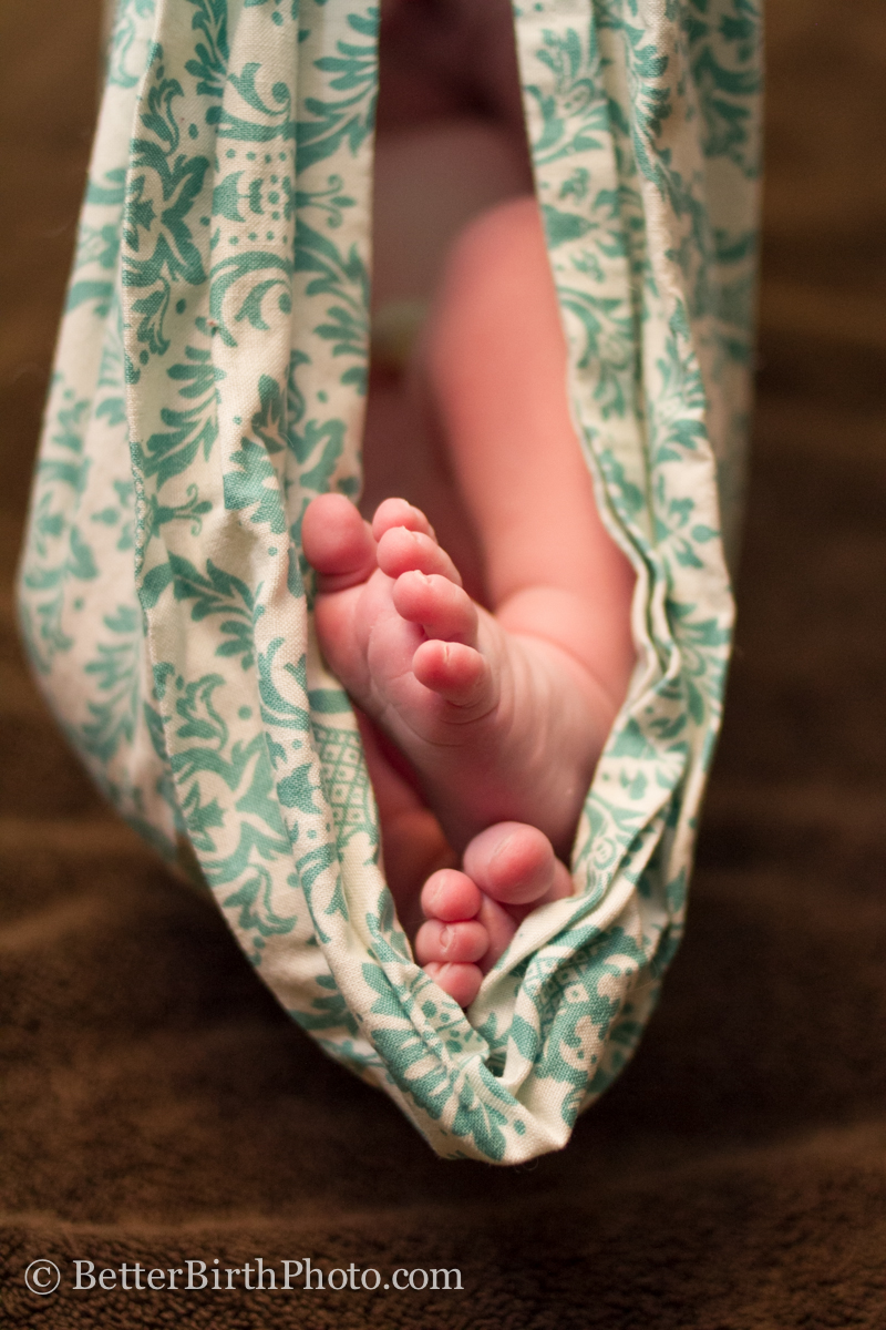 At homebirths one of the responsibilities often given to the father is to weigh the baby (and that's the smiling midwife looking on.) I think it may be that job is shared as holding up a chunky newborn that high in the air takes some good upper body strength. 🙂